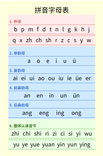 この表は中国の子供たちがピンインを学習しやすいように配列・分類されています。