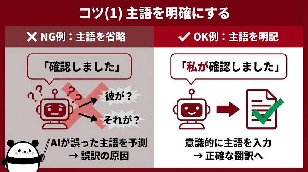 日本語としては少し不自然でも、「私が確認しました」「弊社は提案します」というように、意識的に主語を明確にして入力するのがポイントです。