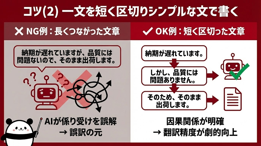 「〜ですが、〜ので」とダラダラつながった文章は、AIが言葉の係り受けを誤解する元になります。