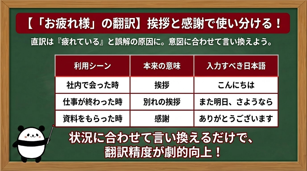 1つの言葉に頼らず、挨拶なら「こんにちは」、退勤するときは「また明日」、感謝は「ありがとう」のように状況に応じて言い換えれば、翻訳の精度は劇的に向上します。