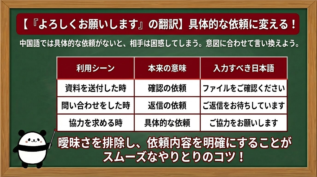 「よろしくお願いします」は、相手にその後の対応を委ねる便利な表現ですが、中国語では具体的に「何をしてほしいのか」が書かれていないと、相手はどう動けば良いのか分からず困惑してしまいます。