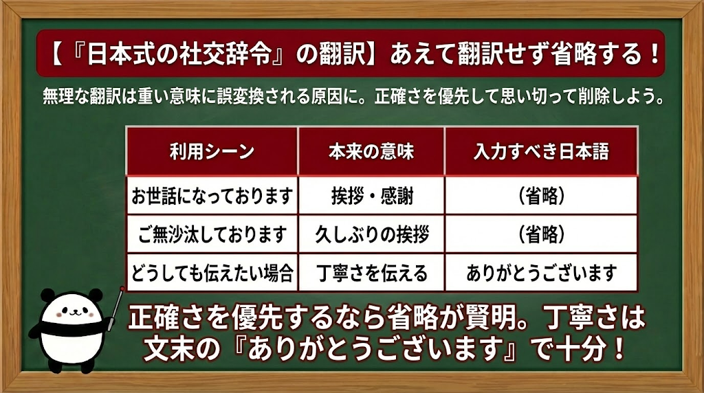 ビジネスメールでよく使われる「お世話になっております」や「ご無沙汰しております」といった儀礼的な挨拶は、AIにとって翻訳の邪魔になりがちです。