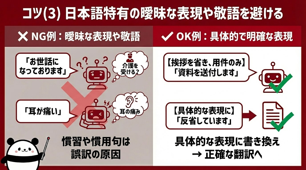 コツ(3)日本語特有の曖昧な表現や敬語を避ける