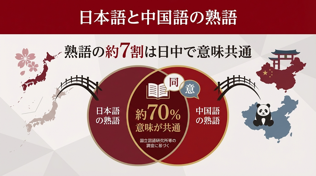 国立国語研究所などの調査や中日対照言語学の研究(孫建平, 1991など)によれば、熟語のうち約70%は意味が共通していると報告されています。
