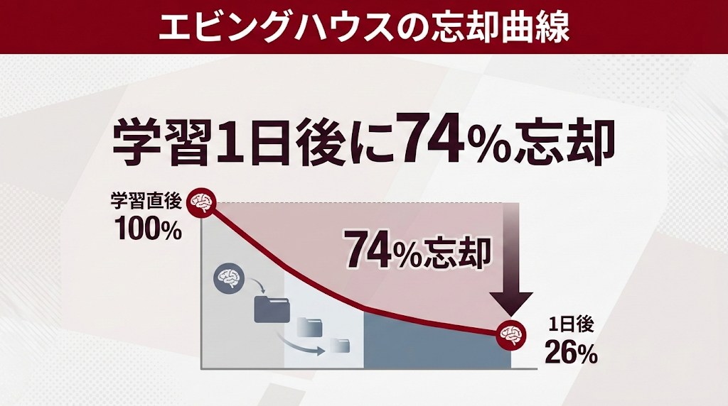 学習からわずか1日後には、74%もの情報が失われると彼は示しました。