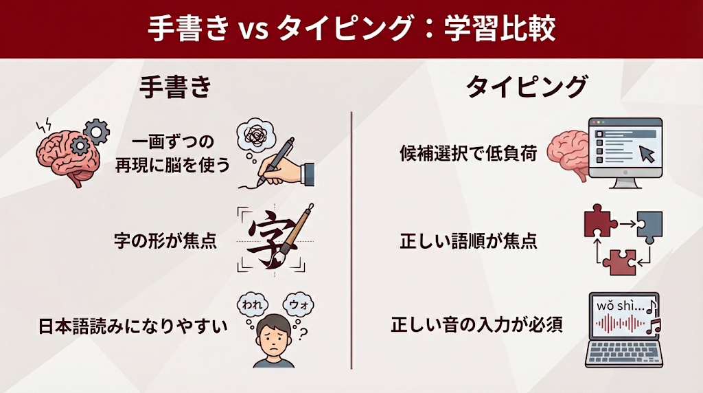 タイピングなら発音と語順に集中でき、結果として使える中国語が早く身につきます。