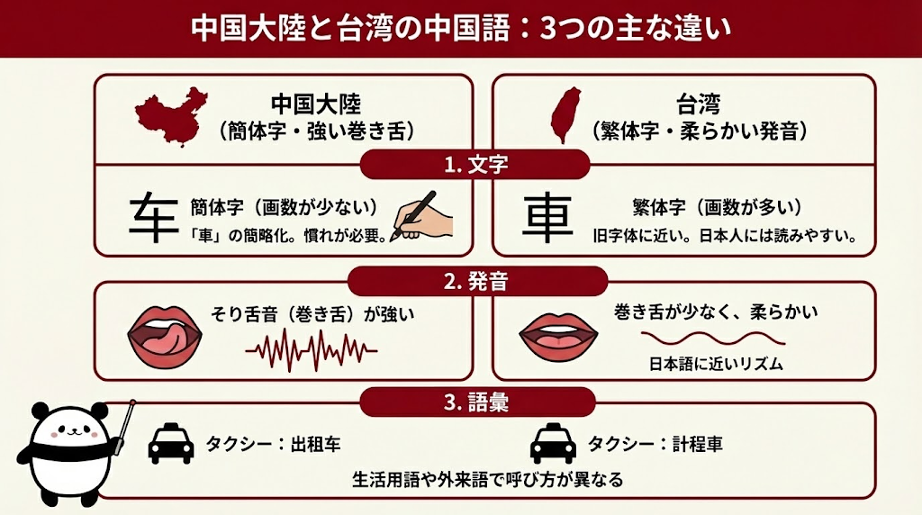 一方で、台湾ならではの漢字や語彙、発音の特徴があります。