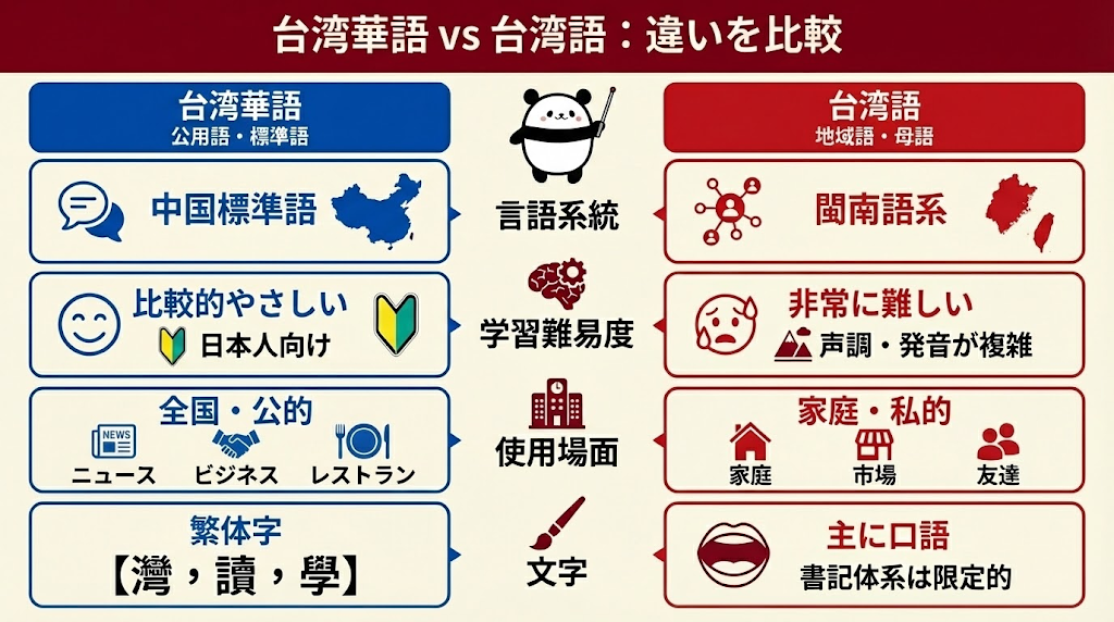 台湾の言語で最初に混乱しやすいのが、「台湾華語」と「台湾語」の違いです。